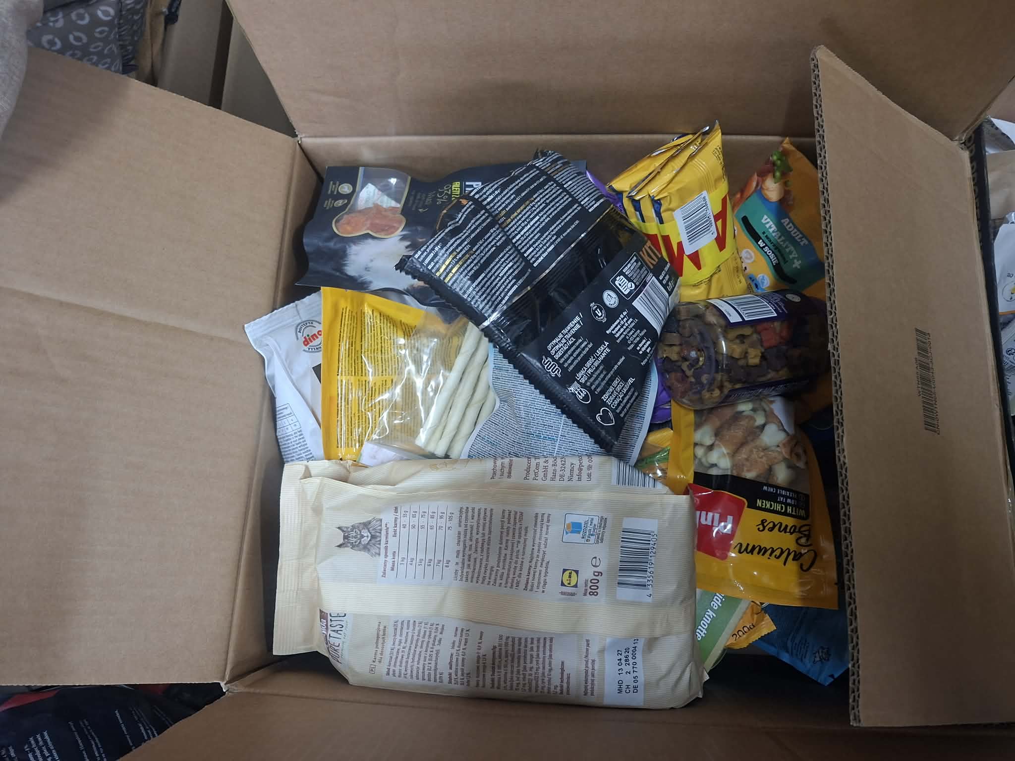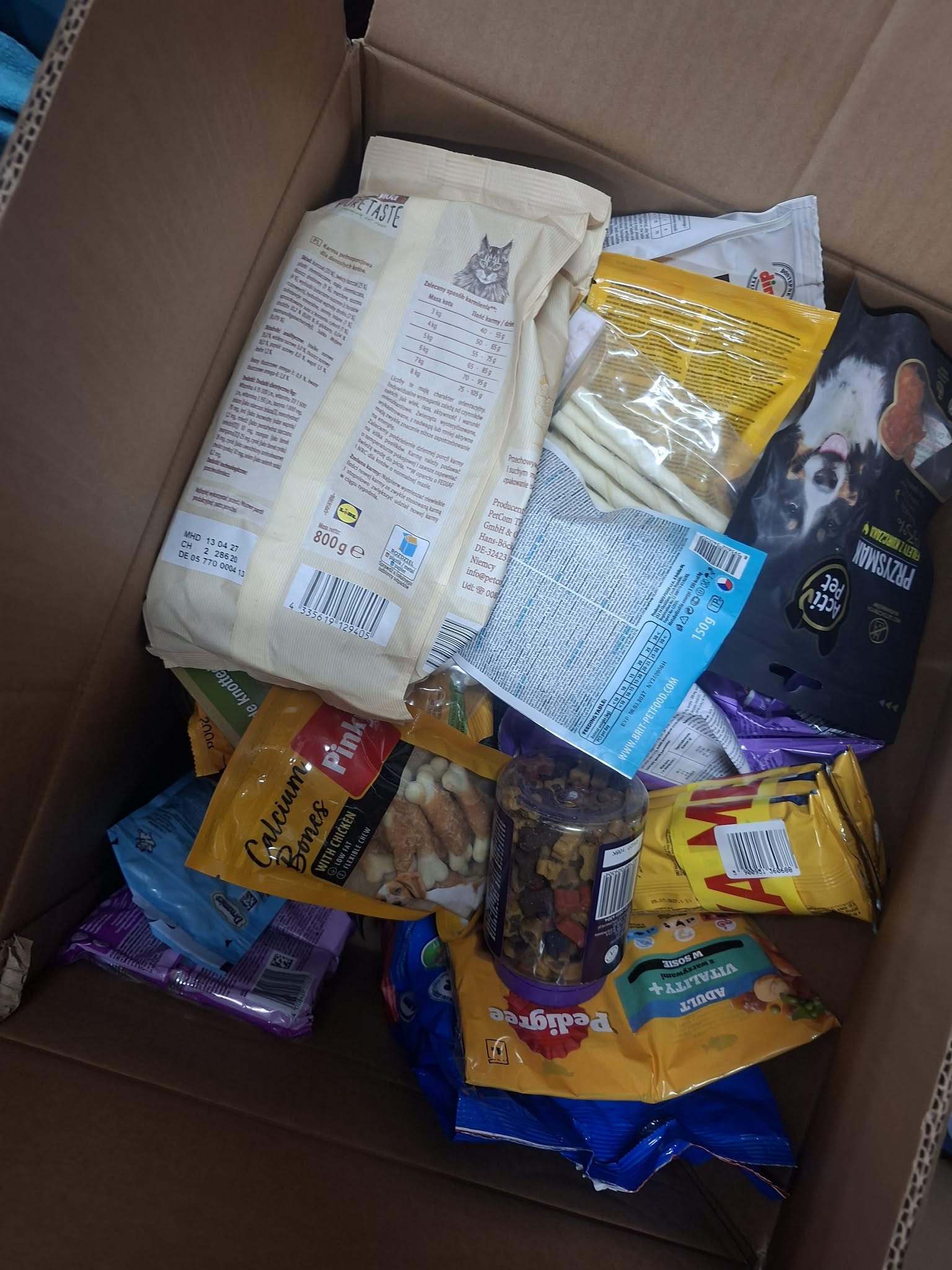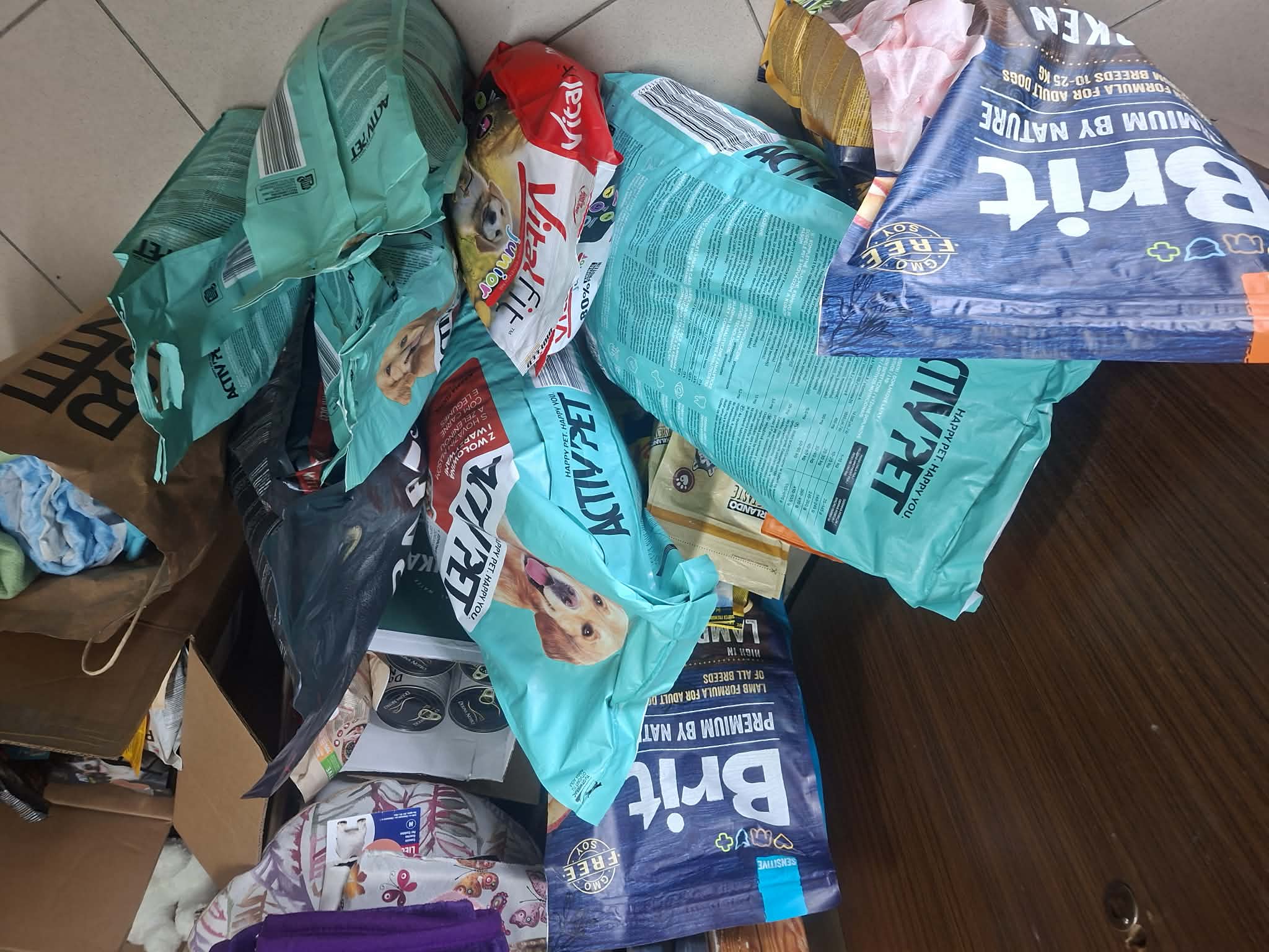 Dzięki ogromnemu zaangażowaniu uczniów oraz ich rodziców udało się zebrać bardzo dużą ilość darów. Wśród nich znalazły się m.in. karma dla psów i kotów, puszki, przysmaki, koce, legowiska oraz zabawki – co doskonale widać na załączonych zdjęciach.