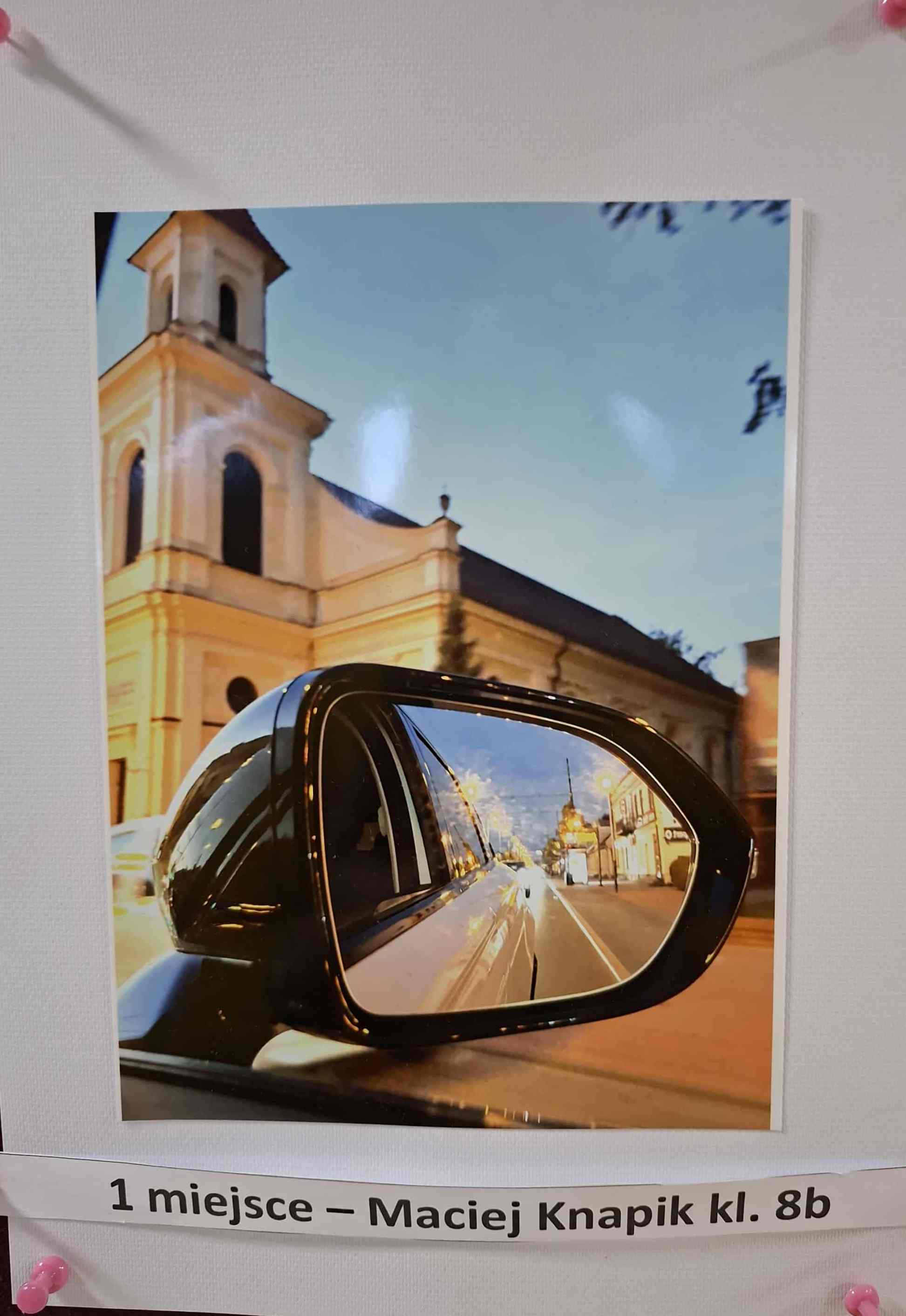 za fotografię ukazującą miasto w odbiciu lusterka samochodu – nowoczesne spojrzenie na tradycję i historię.2 miejsce – Maria Roman, kl. 8c