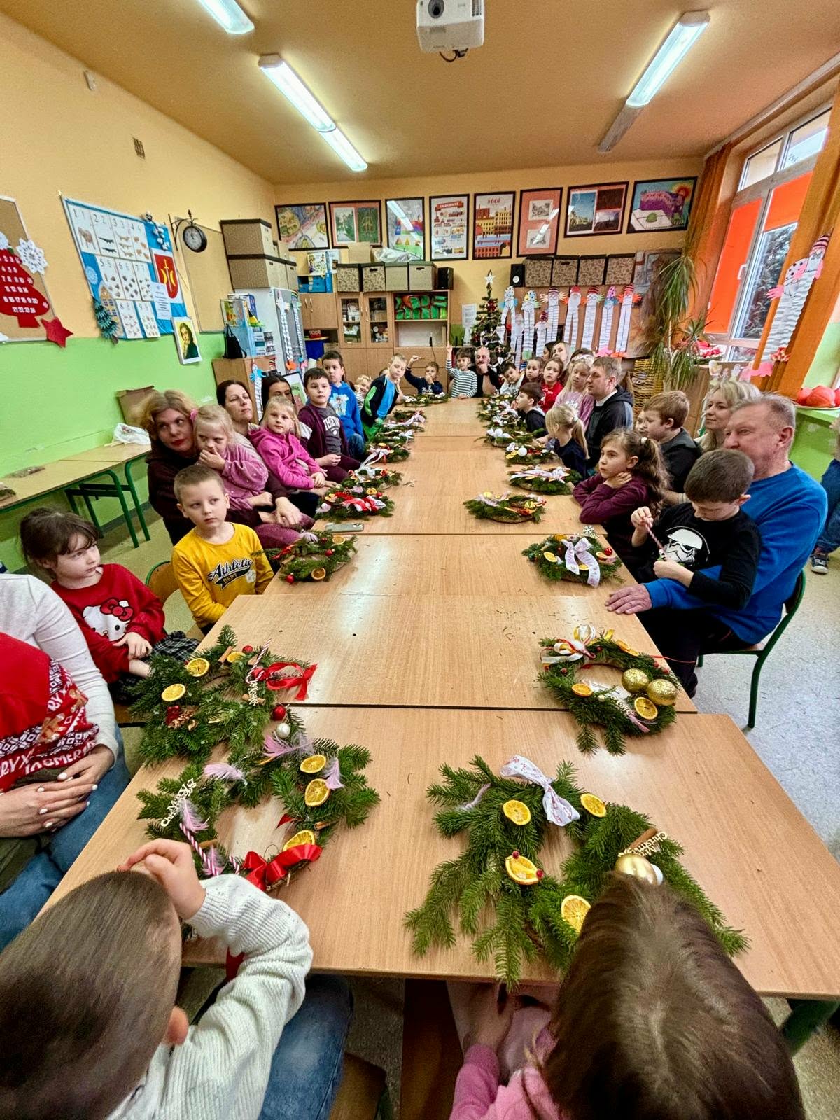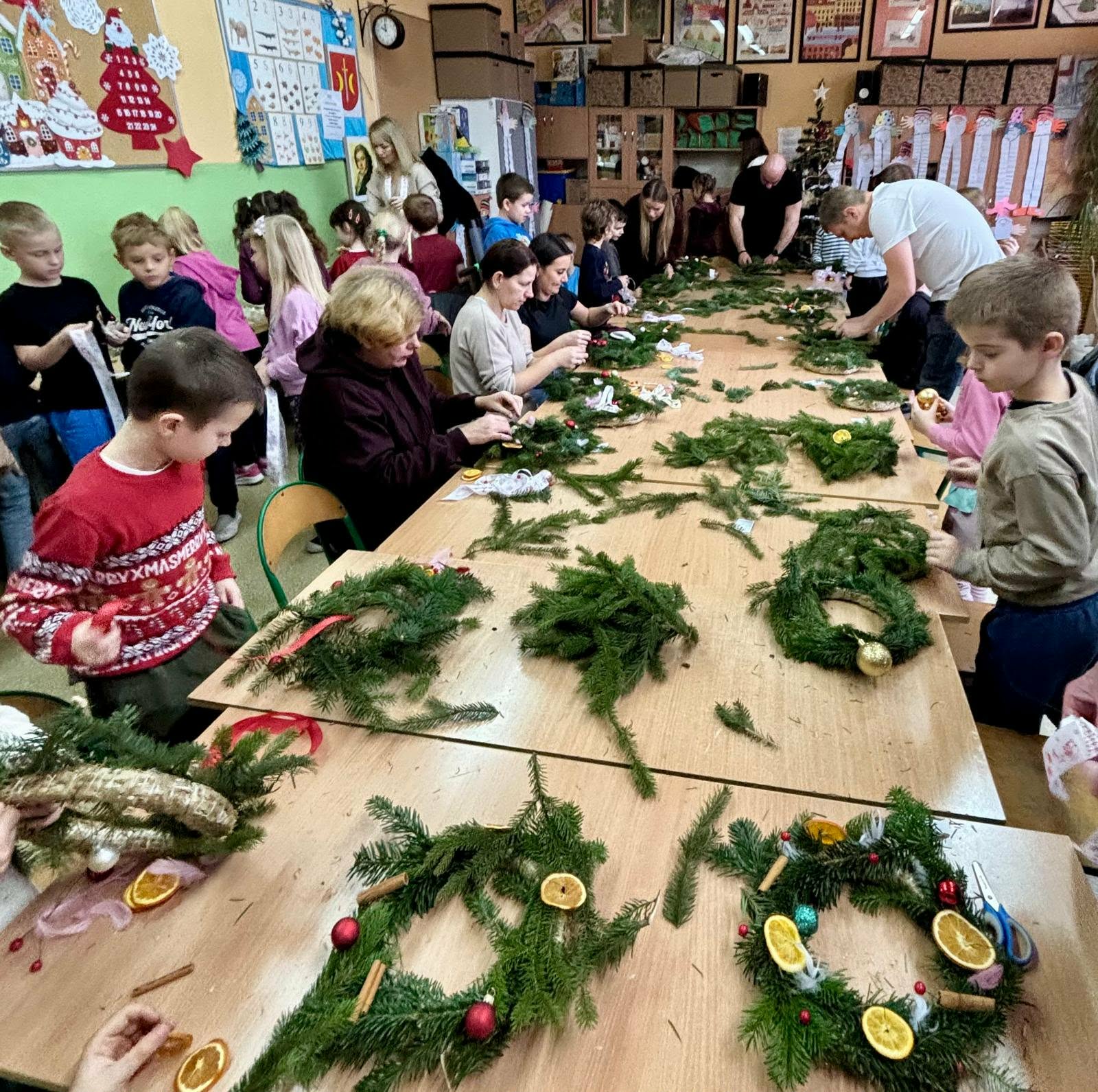 Uczniowie pracowali według określonej „receptury” – odczytywali listę potrzebnych materiałów, planowali rozmieszczenie ozdób i samodzielnie wykonywali świąteczne wieńce. Ćwiczyli przy tym uważne czytanie, liczenie oraz współpracę w grupie.